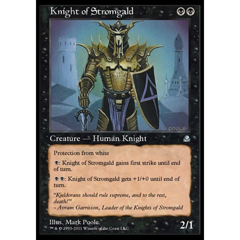 Protection from white{B}: Knight of Stromgald gains first strike until end of turn.{B}{B}: Knight of Stromgald gets +1/+0 until end of turn.